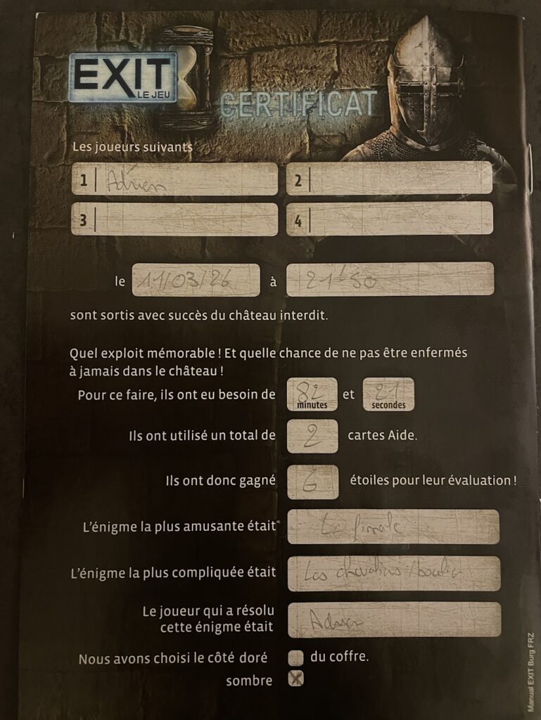 Tout n’est pas parfait pour autant. Une énigme autour des chevaliers et des boucliers m’a posé quelques difficultés, notamment à cause d’une étape clé que je n’avais pas identifiée, ce qui m’a coûté deux indices. La mise en place de l’énigme finale manque également un peu d’intuitivité malgré un code couleur présent, même si sa résolution reste agréable une fois lancée.